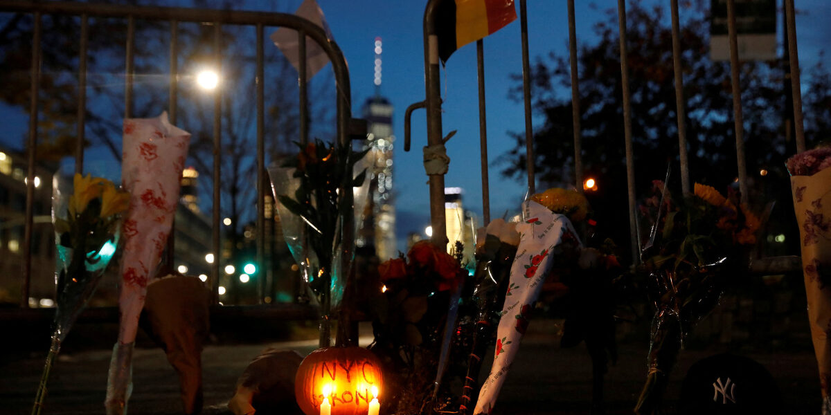 A makeshift memorial for victims of the attack is seen outside a police barricade on the bike path next to West Street, a day after a man driving a...